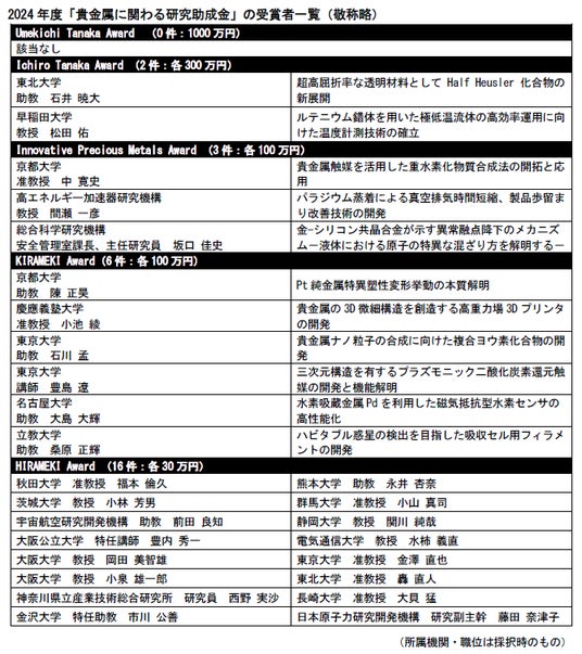 田中貴金属記念財団 「貴金属に関わる研究助成金」 の受賞者を発表
