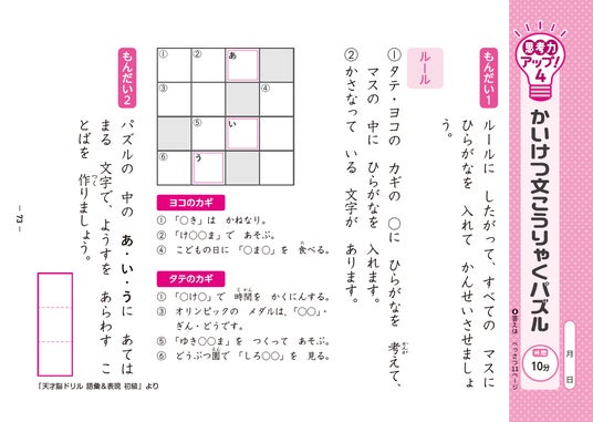 文字うめ、しりとりめいろ、とんち文字、漢字クロスワードなどで、読解力の基礎となる語彙力を複合的に養います。