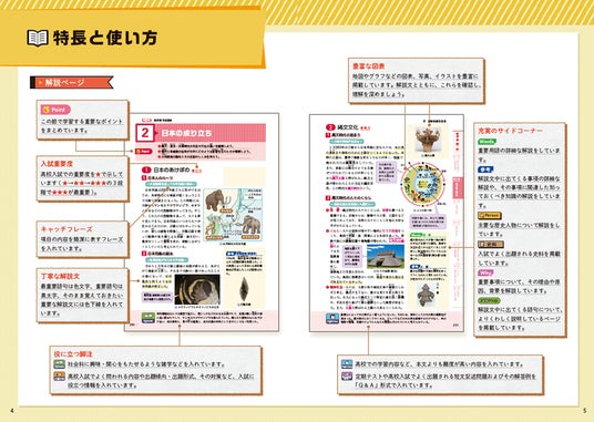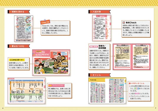 豊富な写真や図版を使ったオールカラーの構成で、学習の要点をきめ細かく段階を区切って解説。マンガで始まる導入部や、入試にも教養としても役立つコラムやトピックを織り交ぜ、学習者がひとりでも学びやすく飽きのこない工夫を凝らしています。
