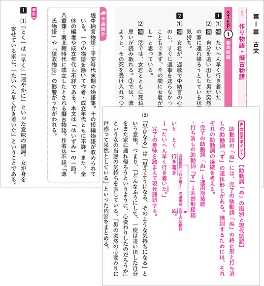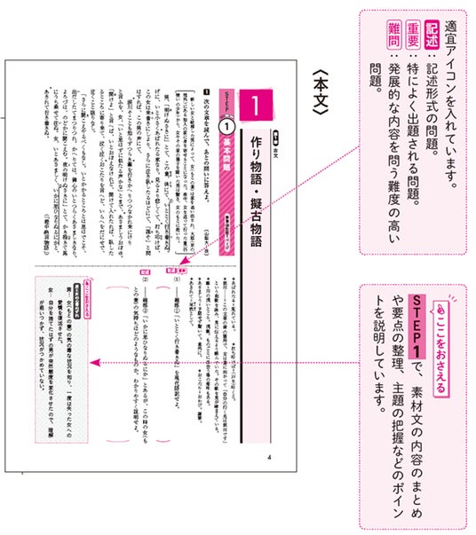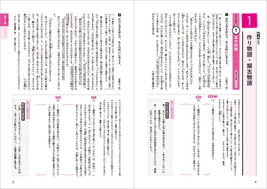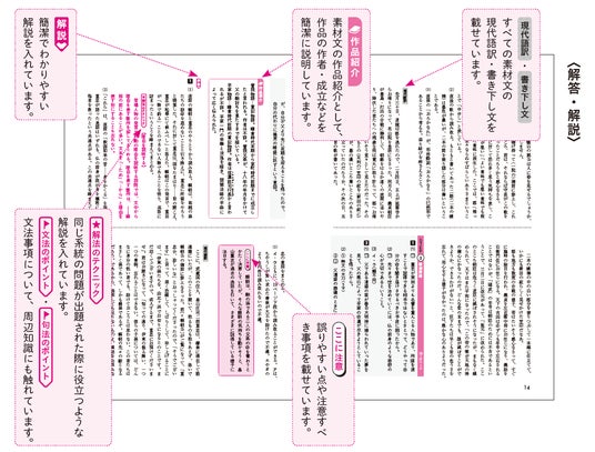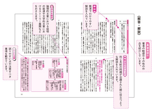 詳しい解説のほか、理解を深めるために「解法のテクニック」「ここに注意」を設けました。また、現代文には話の展開が把握できる「流れを確認」を設け、古文・漢文には、「文法のポイント」(古文)、「句法のポイント」(漢文)、古文と漢文の現代語訳、漢文の書き下し文を掲載しています。