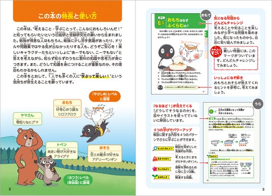 ペンギンの「おそら」 ・ フクロウの「おもち」 ・ アライグマの「トペン」 ・ ヒグマの「ヤマさん」が、考えるためのアドバイスをくれます。
