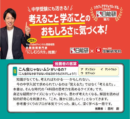登録者数13万人の人気YouTuber受験指導専門家「にしむら先生」推薦、「シカクいアタマをマルくする。」でおなじみの日能研協力!『クイズで地頭がみるみる良くなる思考力チャレンジ』が新登場!