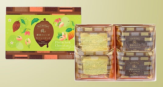なめらかな生チョコレートと、ふわふわ食感のスポンジが口の中でほどけるケーキです。ビターな味わいのショコラと、ナッティなピスタチオの2種類をアソートしました。