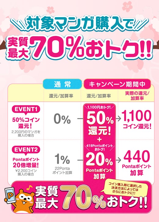 「Pontaマンガ」は、Pontaアプリをはじめ、PontaWebなどのPontaオウンドメディアから利用できる総合型電子マンガ書店です。このたびの「Pontaマンガ 春のPontaマンガ祭」では、期間中にコインを購入すると購入金額の20%相当がPontaポイントで加算され、対象マンガを購入すると消費したコインの50%相当のコインが還元される、実質70%分おトクなキャンペーンを実施いたします。