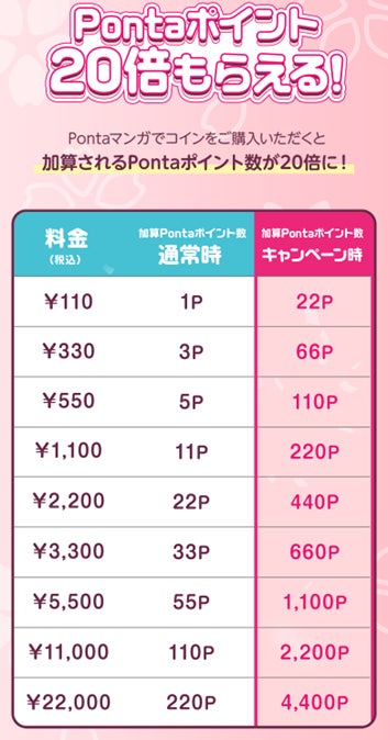 マンガを読むためのコインを購入した際、通常時の20倍のPontaポイントを加算