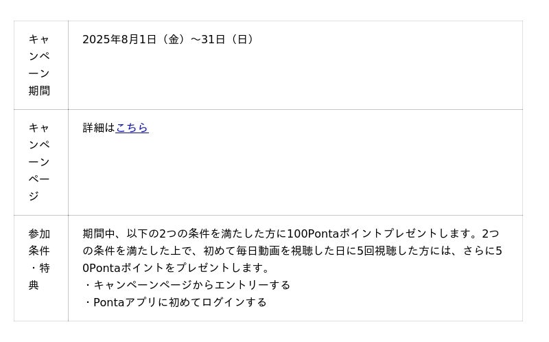 さらに、初めてアプリを利用する方は、「新規ログインキャンペーン」にもご参加いただけます。期間中にキャンペーンページからエントリーした後、「Pontaアプリ」に初めてログインした方を対象に、もれなく100Pontaポイントをプレゼントします。「Ponta毎日動画」を初めて利用し、同日中に5回視聴した方には、もれなく50Pontaポイントを追加でプレゼントします。