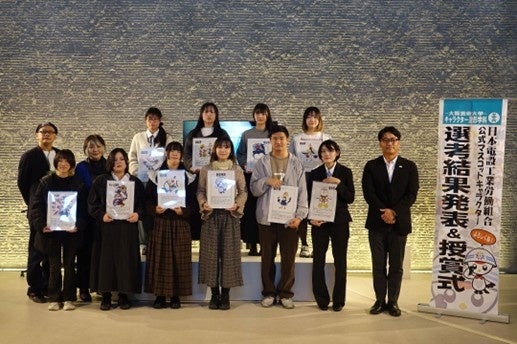 開催にあたっては、キャラクター造形学科の有馬 啓太郎教授が、学生への説明、作品募集など多岐にわたる調整を行い、学生からは総数92作品の熱意ある応募作品が寄せられました。これらの応募作品は日本電設工業労働組合の組合員投票による厳正なる審査が行われ、キャラクター造形学科ゲームコース3年生 吉井 輝さんの作品が最優秀賞、および公式マスコットキャラクターに選ばれました。