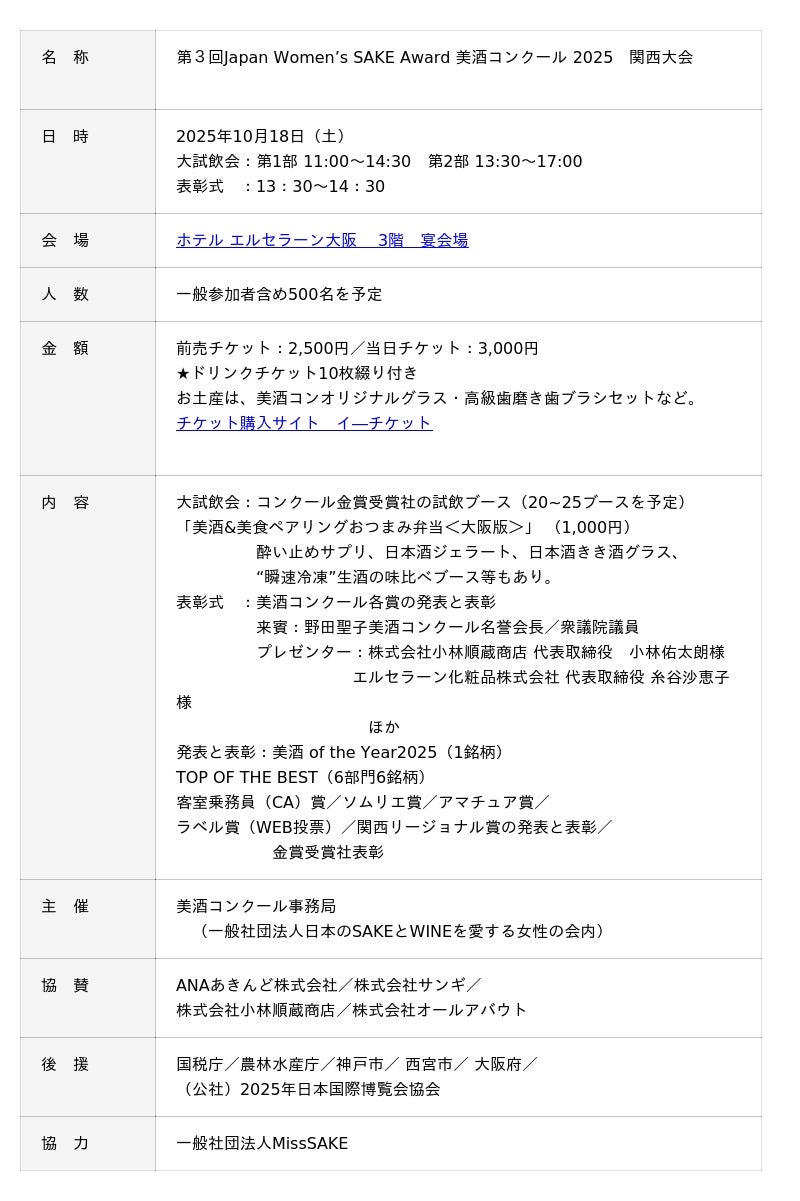 国内初の女性審査員による国際的な日本酒品評会「Japan Women’s SAKE Award~美酒コンクール~(通称:美酒コン)」の金賞受賞酒が発表になりました。今年の審査(9月7日開催)と表彰式&大試飲会は、コンクール理念の一つでもある「地酒のある地域の活性」という点から関西大会です。10月18日(土)の表彰式では、金賞受賞社の表彰と、6部門(*注)の【TOP OF THE BEST】(6社)、「CA賞」「ソムリエ賞」「アマチュア賞」「ラベル賞」の特別賞(各1社)、「関西リージョナル賞」(数社予定)、さらに、今年の最高峰である『美酒 of the Year 2025』の当日発表と表彰が行われます。会場は、ホテル エルセラーン大阪(3階 宴会場)。受賞酒の大試飲会、表彰式ともに、どなたでもご参加OK。会場でお待ちしています!