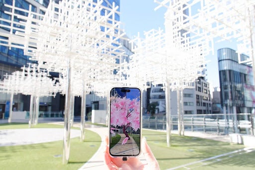 屋外の「 にぎわいSTAGE 」では、足元に設置されたQRコードをスマートフォンで読み取ることで、満開の桜と、花が舞う運気を感じられるARを体験することができます。