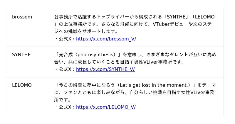「新たな一歩を踏み出す場所を“より多くの人に”」をビジョンに掲げ、「brossom(ブロッサム)」「SYNTHE(シンセ)」「LELOMO(レロモ)」の3つのVLiver事務所を運営しています。