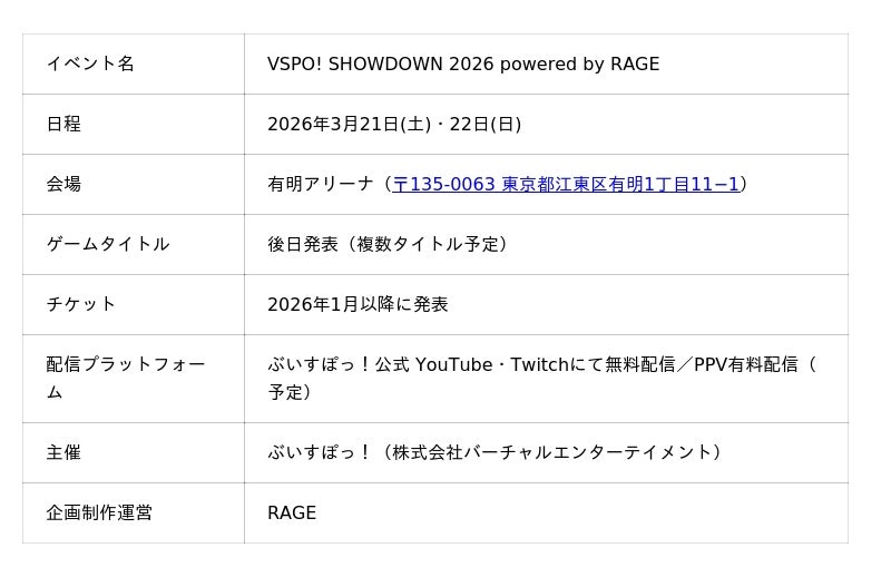 ■『VSPO! SHOWDOWN 2026 powered by RAGE』概要