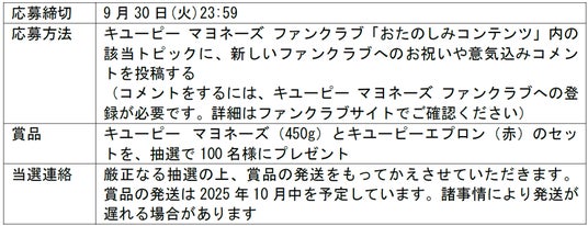 キユーピー マヨネーズ ファンクラブに登録※2し、リニューアルしたことへのお祝いのコメントや、「こんなことをしてみたい!」「こんな風に楽しんでいきたい!」という意気込みを該当トピックへコメントした上で、応募フォームにご入力いただいた方が対象です。