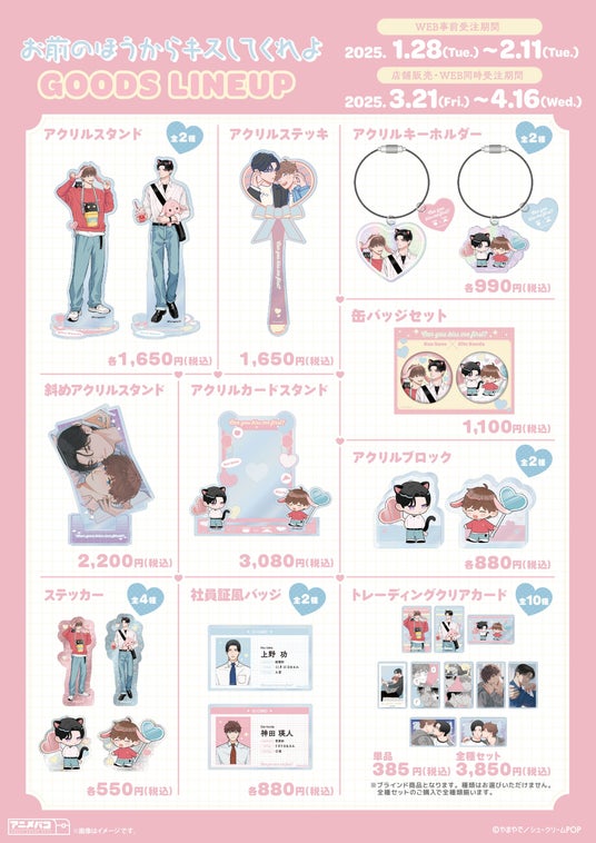 株式会社coly(本社:東京都港区赤坂、代表取締役:中島杏奈)が運営する「アニメバコ」(https://www.animebako.com/)は、株式会社シュークリーム(本社:東京都新宿区、代表取締役:萬眞理子)の人気漫画『お前のほうからキスしてくれよ』(著:やまやで)の描き下ろしイラストを使用した商品を、アニメガ×ソフマップにて発売いたしますので、お知らせします。