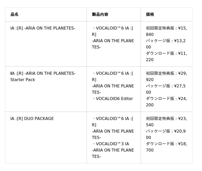 本製品「IA :[R] -ARIA ON THE PLANETES-」(読み:イア リブレス -アリア オン ザ プラネテス -)は、ボカロのIA由来の透明感あふれる声色を大切に継承しながら、より自然で滑らかな歌唱表現、幅広いジャンルや多彩な歌唱アプローチに対応する柔軟性と操作性を追求したボイスバンクです。