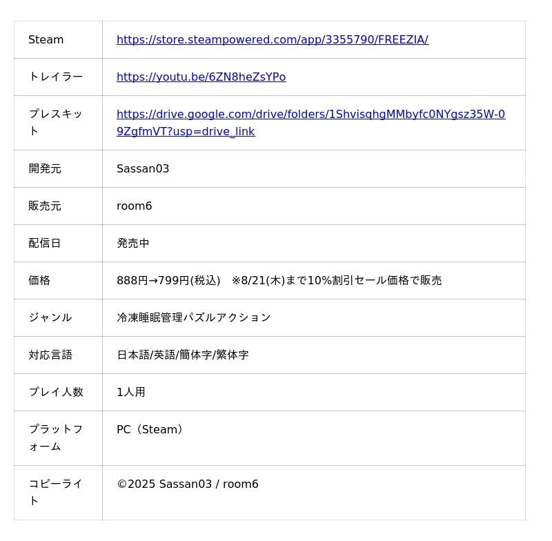 株式会社room6(本社:京都市左京区、代表取締役:木村征史、以下、room6)は、『FREEZIA』を本日Steamにて発売したことをお知らせします。