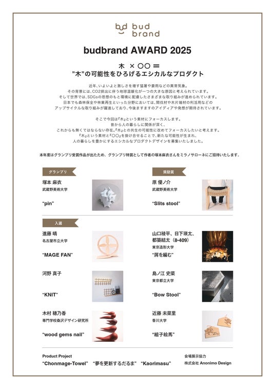 budbrand AWARD 2025 U-35では、100名以上の応募から8作品が選定され出展されます。コンテストで選ばれたグランプリ作品、奨励賞作品、入選作品、bud brandとの共同プロダクト作品が展示されます。