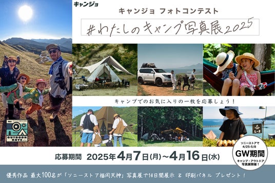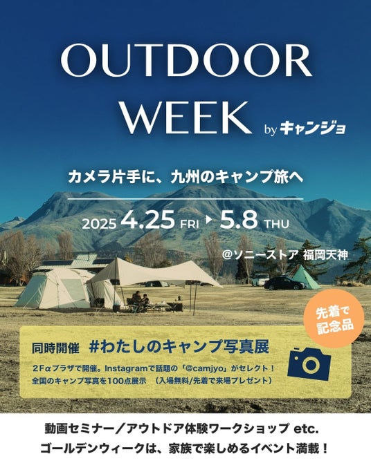 本イベントは、キャンプ女子株式会社とソニーストア 福岡天神が主催する「OUTDOOR WEEK by キャンジョ」の開催を記念して行われます。同日より、全国から選ばれた優秀作品100点がソニーストア 福岡天神のαギャラリーにて展示される「#わたしのキャンプ写真展2025」(4月25日~5月8日)も同日開催されます。また、映像作品を公募する「九州アウトドアムービーコンテスト」も同時スタートします。