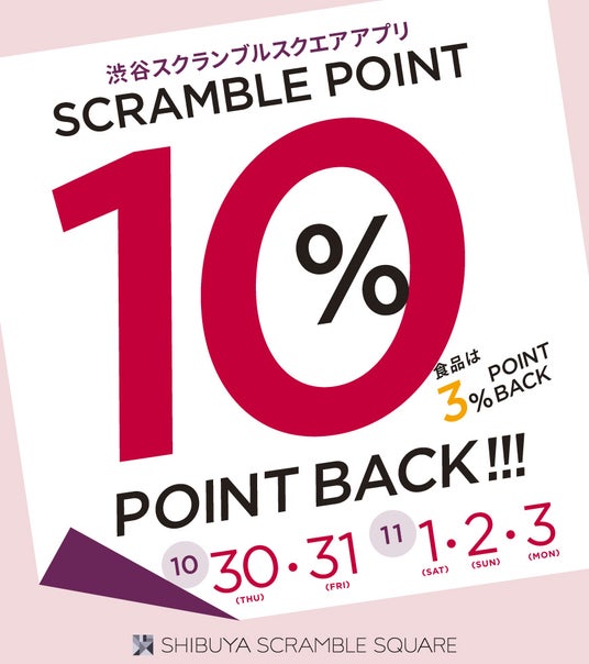 10月30日(木)~11月3日(月・祝)まで、渋谷スクランブルスクエアアプリでのお支払いでスクランブルポイントがお得に貯まるキャンペーンを開催します。【対象期間】10月30日(木)~11月3日(月・祝)