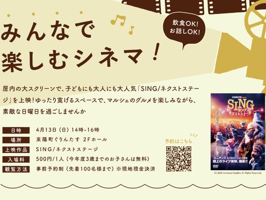 1日目は、ハワイアンミュージックバンドの演奏、2日目は、屋内のぐりんたすホールで「SING/ネクストステージ」が上映予定となっています。映画はお一人様500円で、事前予約制(定員100名・現地にて現金払い)となります。キッチンカーのフードと一緒に、大画面でご自由に映画をお楽しみいただけます!