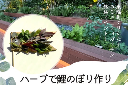 竹中工務店による 「ハーブで鯉のぼり作り体験」 東陽町ぐりんたす北側ガーデンにて、『ハーブで鯉のぼり作りワークショップ』を開催いたします。予約不要・無料で子どもから大人まで参加できます!ローズマリー、ミント等少量お持ち帰りいただけます。参加費用:無料