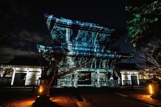 また、本堂奥の大方丈に復元された冷泉為恭筆・大方丈障壁画の襖の間や位牌堂を夜ならではの幻想的な光で彩り、大方丈障壁画49面とともに重要文化財に指定され40年以上公開されていない「板絵著色杉戸絵」16面と「小方丈杉戸絵」6面あわせて22面の高精細デジタルデータを初めて活用し、プロジェクションマッピングで杉戸絵の世界を再現する夜間特別拝観を行いました。
