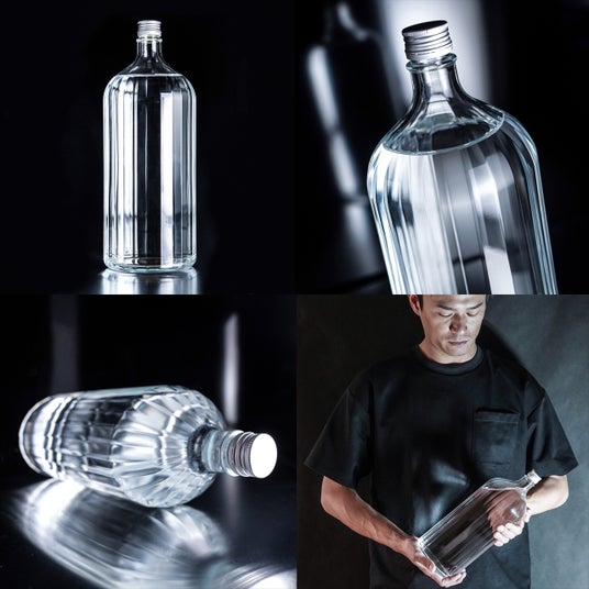 家庭用冷蔵庫にも収まるサイズ・形状で、既存の一升びんに負けない魅力を放つびんを。そこで考えたのが、手にも馴染む楕円形シルエットと、光をプリズムのように散乱させる多面カットです。日本精工硝子さんの高透明なガラス製造技術により、キラキラと澄んだ輝きが実現しました。