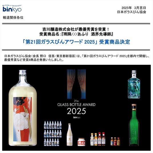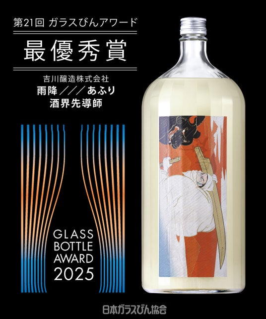 吉川醸造株式会社(神奈川県伊勢原市、代表取締役:合頭義理)の製造する『雨降///あふり 酒界先導師』の1.8Lびんが、「第21回ガラスびんアワード2025」において最優秀賞を受賞しました。
