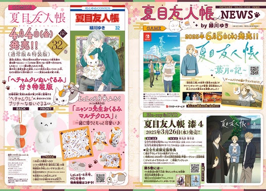 株式会社白泉社(本社:東京都千代田区、代表取締役社長:高木靖文)は、『LaLa』2025年5月号を3月24日(月)に発売しました。表紙は最新HC32巻が4月4日(金)に発売する「夏目友人帳」(緑川ゆき)。ふろくには「夏目友人帳ドラマCD『よろづよのみかん』by 緑川ゆき」がついてくる!巻頭カラーは、待望のHCS第1巻が4月4日(金)に発売する「汐風と竜のすみか」(縞あさと)が登場です。ドキドキの最終回を迎える「まいりましたと言わせたい」(あきもと明希)とHC2巻の発売が6月5日(木)予定の「そのメイド、危険につき」(マコト)はカラーつきで登場です。そのほか最新情報も盛りだくさん!