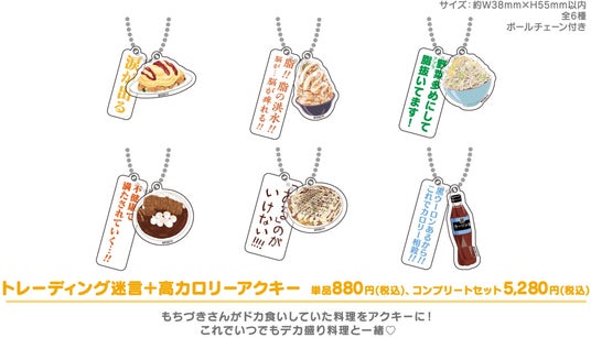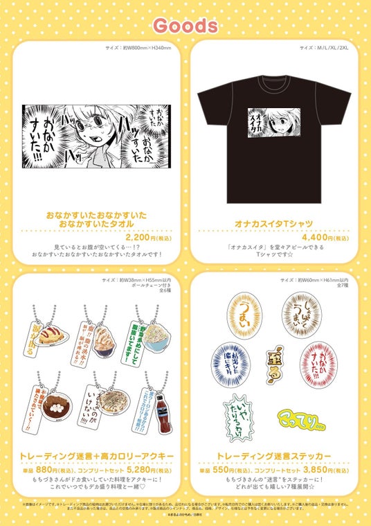 アクキー、ステッカー、タオルなどの定番商品から、「カロリー×1/2皿」など『ドカ食いダイスキ!もちづきさん』ならではのオリジナルグッズもモリモリご用意しております!