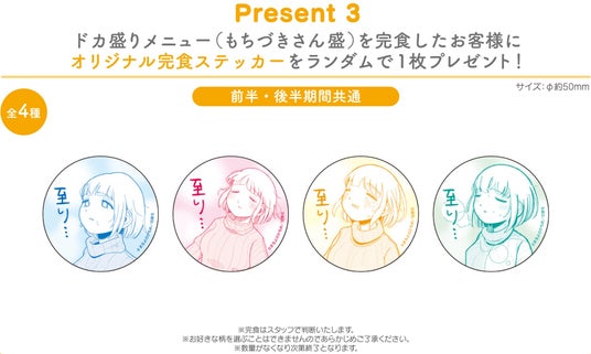オリジナルコースター、オリジナルポストカード、もちづきさん盛を完食されたお客様へのオリジナル完食ステッカー、計3パターンをご用意!