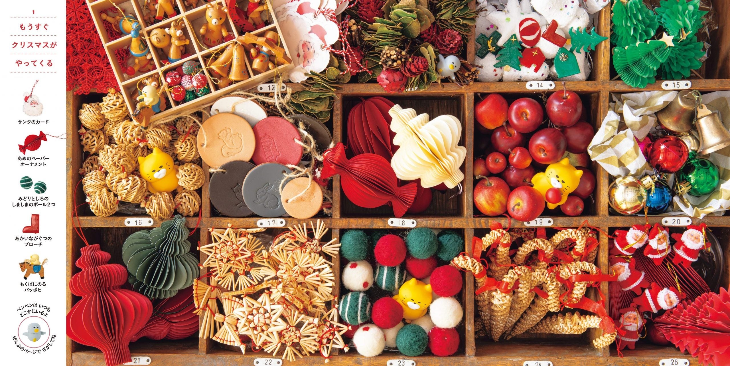 大人気「さがしえブック」シリーズ第4弾は、“クリスマス”でさがしもの! 特典として、ネイビー地の「もこもこポーチ」が付いています。しましまのマフラーとノラネコの顔部分はふわふわのサガラ刺繍、ファスナーには雪だるまとノラネコのラバーチャーム付き。裏地もかわいい総柄になっています! 内ポケットあり。クリスマスギフトにもぴったりの、豪華なセットです♪