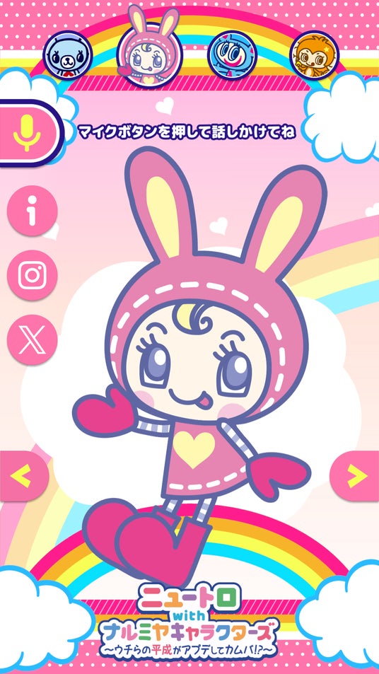 音声を認識し、それぞれのキャラクターがテキストでお返事します。特徴を再現したおしゃべりをぜひ体験してみてください。ナカムラくんたちのキュートな姿と反応にも注目です!画面上でどのキャラクターとおしゃべりするかを選択することができます。
