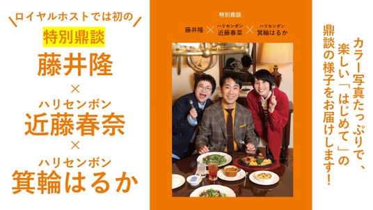 本書には、藤井隆さんとハリセンボン・近藤春菜さん、箕輪はるかさんの特別鼎談も収録されています。鼎談に参加いただいたお三方は、さまざまなメディアでロイヤルホストファンを公言し、ロイヤルホストとのコラボアルバム『Music Restaurant Royal Host』もリリースしている藤井隆さんと、ご自身のYouTubeチャンネル「ハリセンボンOfficialChannel」でモーニングメニューを紹介されている姿が話題になったハリセンボンの近藤春菜さん、箕輪はるかさん。ロイヤルホストを愛してやまないお三方が、ロイヤルホストで顔を合わせるのは意外にもはじめて。お好きなメニューをご注文いただき、料理を口にしながらロイヤルホストへの愛を語り尽くす幸福に満ちた鼎談をぜひお楽しみに。