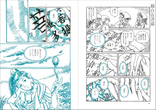 こうのさんがこのたび挑む題材は、日本で最も有名であろうお経、般若心経! なんと全編が黒色と空色、2色の万年筆で描かれる、新しくとびきり美しいオール2色コミックです。