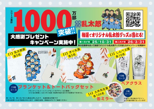 朝日新聞出版は「落第忍者乱太郎」(著・尼子騒兵衛)の1000万部突破を記念したプレゼントキャンペーンを開催します。対象作品のフェア帯についている応募券を送ると、抽選で240名に豪華オリジナルグッズが当たります。また、フェア参加店では、購入者特典として土井先生スペシャルカードを配布し、一部書店では複製原画展も同時開催します。『小説 落第忍者乱太郎 ドクタケ忍者隊 最強の軍師 完全版』も本日発売です。