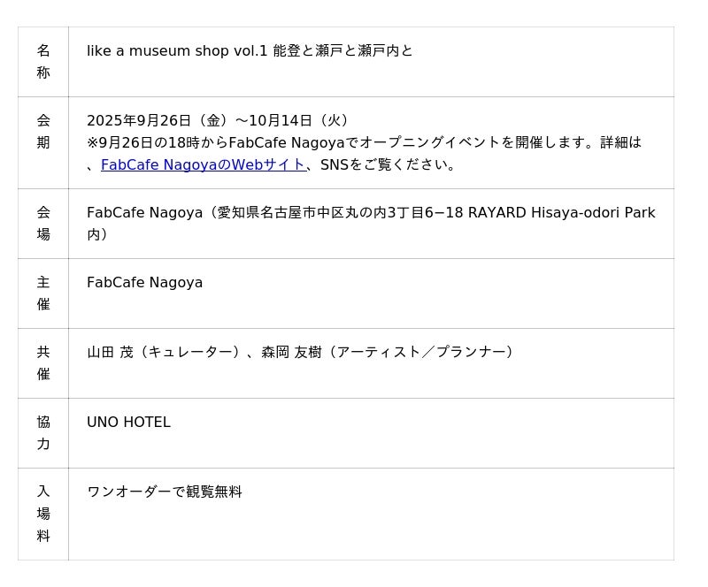 株式会社ロフトワーク(本社:東京都渋谷区、代表取締役:諏訪光洋)と株式会社OKB総研が協働で運営するFabCafe Nagoyaは、令和6年能登半島地震の復興支援プロジェクト「NOTONO」の新たな展開として、能登の伝統工芸や民芸品、現代クリエイティブ作品と、愛知県瀬戸市・瀬戸内地域の品々を一堂に集めた展示販売イベント『like a museum shop vol.1 能登と瀬戸と瀬戸内と』を、2025年9月26日(金)~10月14日(火)に開催します。