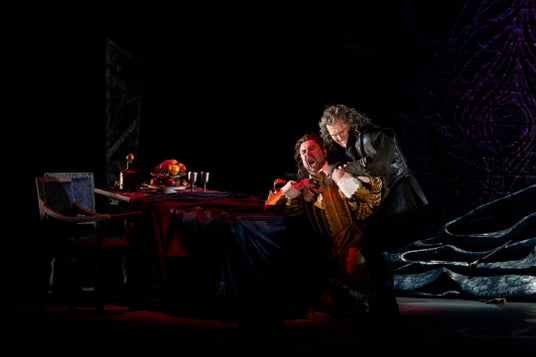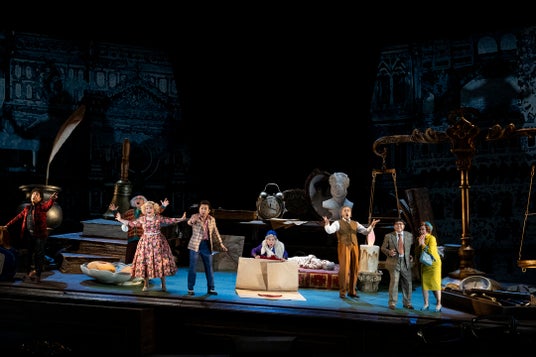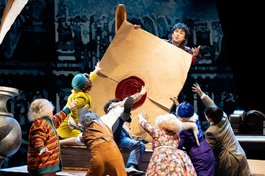幕が開くと、舞台には植物の根に浸食された重厚な建築が登場し、欲望の渦巻く『フィレンツェの悲劇』のグロテスクさを暗示。腹を探り合う男女3人の心理劇が、官能的な音楽と共に繰り広げられます。対する『ジャンニ・スキッキ』では舞台が一転、巨大な書斎机の上で、ミニチュアになった大勢の登場人物たちがちょこまかと私利私欲に邁進する姿を、一種のブラックジョークとして観察することになります。フィレンツェの裏社会を覗き見するようなプロダクションは、贅沢極まる大人のエンターテインメントです。
