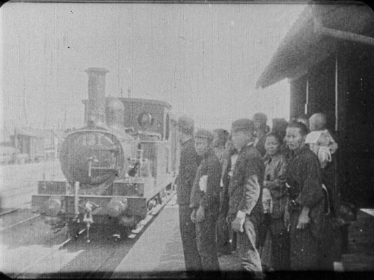 『列車の到着』名古屋駅で撮影された可能性のある作品。鉄道は明治という新しい時代を象徴する交通機関だった。有名なリュミエール社作品『ラ・シオタ駅に到着する列車』を想起させる列車の到着と乗降客の様子は、シネマトグラフの定番の題材だった。