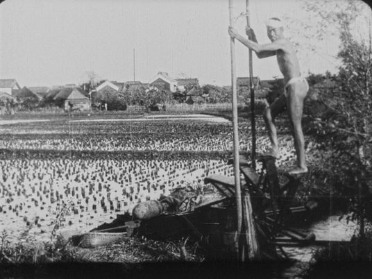 『田に水を送る水車』褌姿になった男性が水車に乗って足で水車を回し、刈取りの終わった田に水を送る。リュミエール社の技師が東京近郊の農村で撮影し、日本で現像した可能性のある作品。