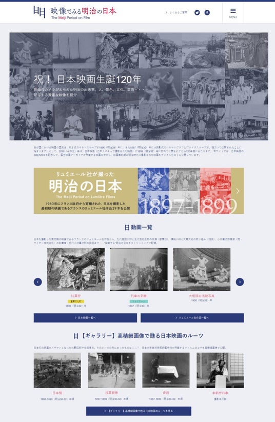 本サイトは、日本映画(日本人によって撮影された映画)が1899(明治32)年の初公開から120年となるのを記念して、当館の所蔵コレクションを配信する2つ目のWEBサイトとして2019年6月27日に開設しました。現存する最古の日本映画で、映画としては初の重要文化財に指定された『紅葉狩』など、明治期に撮影された6本の日本映画を公開しておりますが、新たな作品が加わることにより、明治時代の日本の姿をより多面的に体験していただけるでしょう。