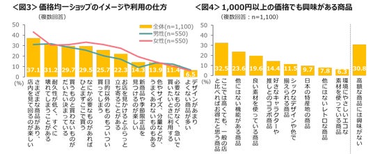 価格均一ショップのイメージは、「さまざまな商品があり、店内を見て回るのが楽しい」が1位。「耐久性が低く、すぐに壊れてしまう」というネガティブなイメージが2位。