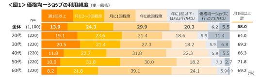 100円ショップ・300円ショップなどの価格均一ショップを月1回以上利用する人は68.0%。