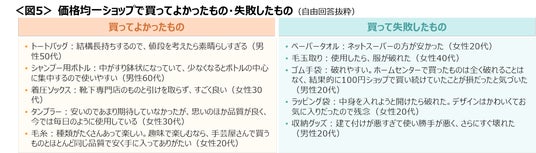 価格均一ショップで買ってよかったものは「専門店と同等の品質だった」「長持ちした」ことが、買って失敗したものとしては「スーパーやホームセンターの方が安かった」「すぐに壊れてしまった」ことが理由としてあげられた。<図5>