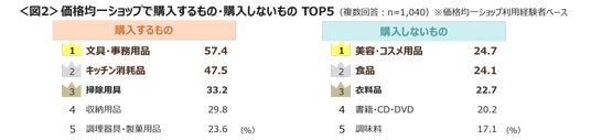 価格均一ショップで購入するものは「文具・事務用品」「キッチン消耗品」「掃除用具」、購入しないものは「美容・コスメ用品」「食品」「衣料品」がTOP3。<図2>
