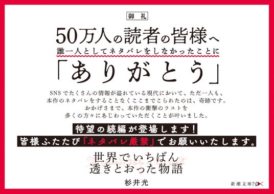 前作『世界でいちばん透きとおった物語』を読んだ読者には、「この衝撃のラストを言いたいけど、ネタバレになってしまうので何も言えない!」というつらい我慢をしていただいたと思います。SNSで情報が溢れる現代において、「ネタバレ厳禁」を、50万人の読者の方々に守っていただけたのは、奇跡です。その感謝の気持ちを込めて、全国書店にて『世界でいちばん透きとおった物語』感謝御礼フェアを開催しております。待望の続編『世界でいちばん透きとおった物語2』につきましても、くれぐれも「ネタバレ厳禁」でお願いいたします。