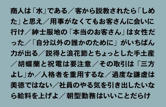 伊藤忠が近年、ここまでの成長を遂げたのには、歴代の経営者が創業以来同社に伝わる「商人の言葉」を胸に、そのアップデートに努めてきたことがあります。「三方よし」「商人は水」「商売は損得だけじゃない」……。同社の社員はみな「同じ言葉」を語ります。ちなみに伊藤忠の企業理念は「三方よし」です。