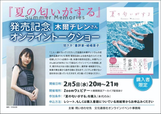 全国の対象書店で木爾チレン『夏の匂いがする』をご購入いただいた方限定で、『夏の匂いがする』発売記念オンライントークショーを開催いたします。購入時に対象書店で入手するレシートもしくは参加券に記載されている二次元バーコードなどからアクセスすることで、オンライントークショーに参加することができます。