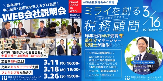 税理士法人を母体に国内外15拠点で各種コンサルティングサービスを展開するアイユーコンサルティンググループ(本社:東京都豊島区、グループ代表:岩永悠/グループ共同代表:出川裕基、以下「当グループ」)は、Great Place to Work(R)InstituteJapan(GPTWジャパン)が発表する2026年版「働きがいのある会社」ランキングにおいて、士業で唯一ベスト100に選出されたことをお知らせいたします。