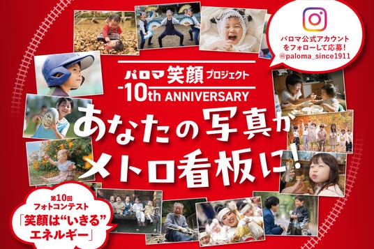株式会社パロマ(愛知県名古屋市/代表取締役社長:小林弘明)は、広告看板写真の公募企画「パロマ笑顔プロジェクト 第10回フォトコンテスト『 笑顔は“いきる”エネルギー 』を11月1日(土)から開始します。ご応募いただいた写真から優秀作品を選出し、東京メトロ及び大阪メトロ内の駅看板広告として使用いたします。