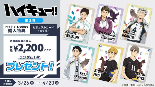 販売期間中(2025/3/26~4/20)、アニメ「ハイキュー!!」第2弾 対象商品を2,200円(税込)お買い上げごとにランダムで【 購入特典 アニメ「ハイキュー!!」ビジュアルカード 第2弾(全6種)】を1枚プレゼントいたします。